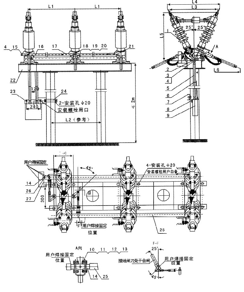6、根據用戶(hù)的方便,操動(dòng)機構可以安裝在任一極的下方,操動(dòng)效果一樣。